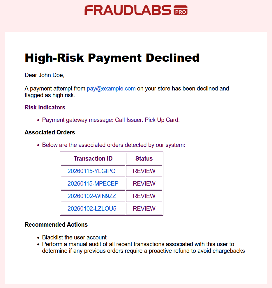 When a high-risk payment is declined, an email notification will be sent to the merchant. Our system uses machine learning, analyzing patterns in historical transaction data and display related orders in the email. The system will also prompt the merchant to manually audit recent transactions linked to the user and proactively refund any at-risk orders to reduce the risk of chargebacks. An example of the email notification as below:
