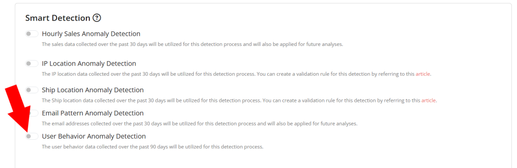 - In the Smart Detection section, you can see there is one button for user behavior detection. This button is to set the detection on or off. By default, this feature is set to off, and you will need to click to enable the feature.